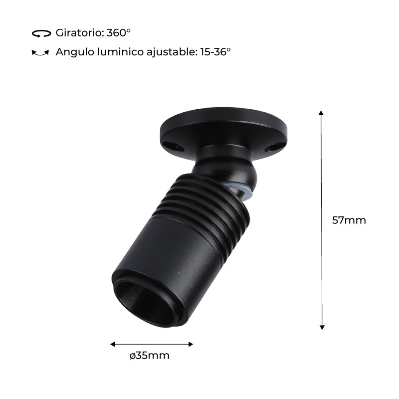 The LED surface spotlight with zoom has a versatile design that allows fully adjustable focal illumination and the possibility of regulating the angle of light aperture from 15° to 36° by rotating the lens.