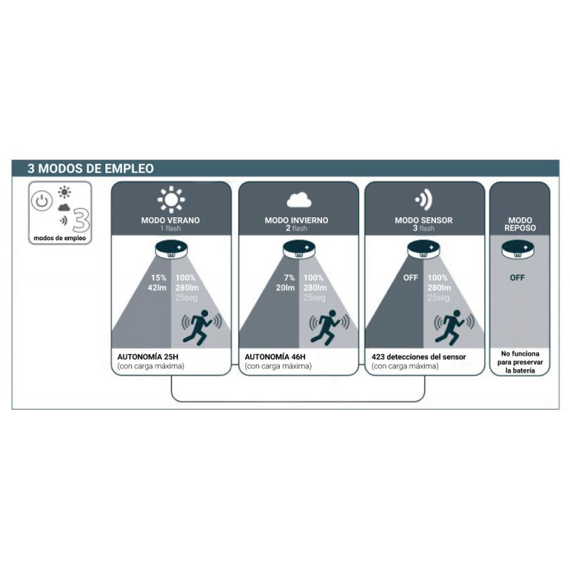 Sensor Mode: El modo sensor activa el sensor PIR de movimiento, con una intensidad lumínica de 280 lúmenes, tiempo activo de 25 segundos.