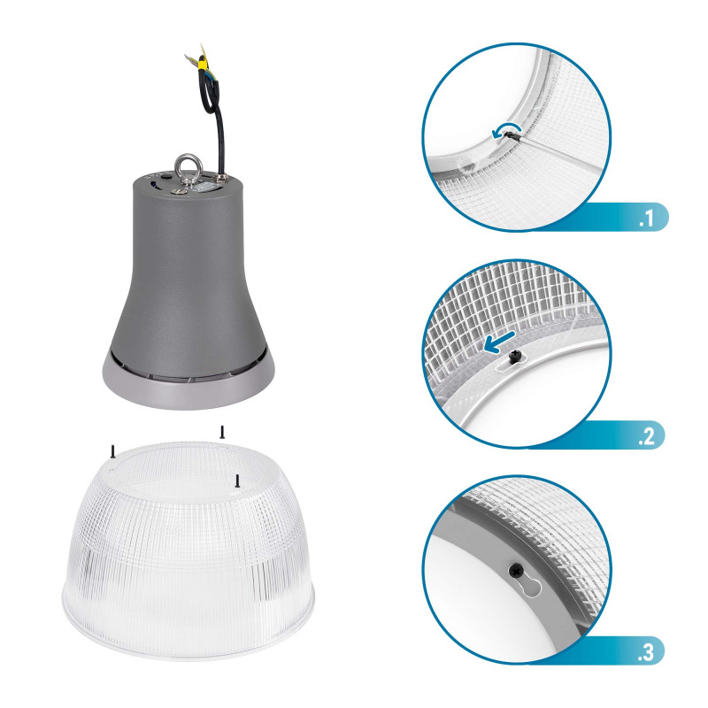 - Reflector de policarbonato transparente: Mejora la estética y optimiza la distribución de la luz.