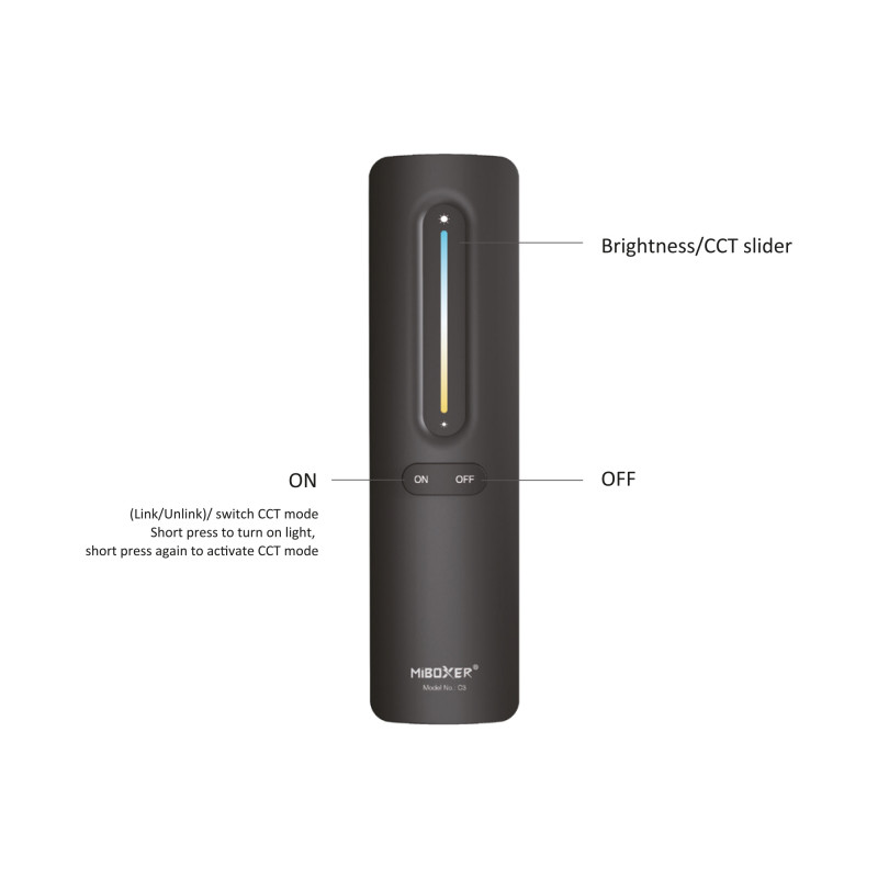 Optimiza tu iluminación con este control remoto RF 2.4G compatible con la serie MiBoxer/Mi-Light. Diseñado para ofrecer comodidad y funcionalidad, permite ajustar el brillo y la temperatura del color de forma intuitiva.