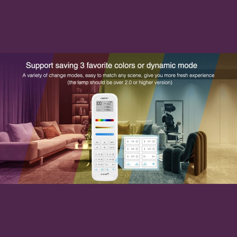 El mando a distancia inalámbrico RGB + CCT "Mi-Light" 100 zonas, funciona a través de un receptor de RF y utiliza la frecuencia estándar de 2.4GHz, capaz de transmitir la señal hasta 30 metros, incluso a través de paredes y techos.