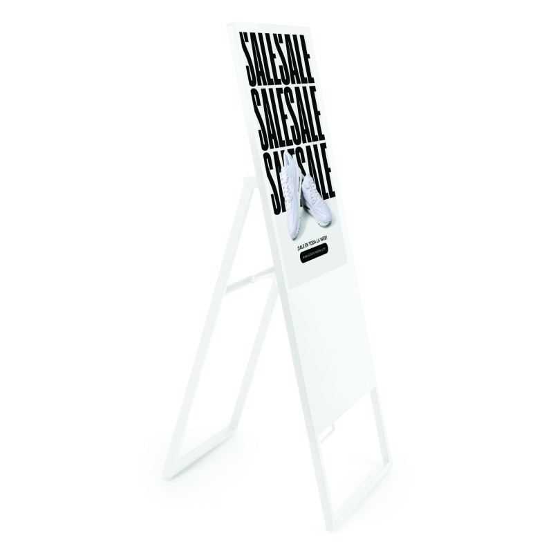 Dieses innovative Werbegerät hat ein elegantes Design in Schwarz oder Weiß. Es besteht aus einer hochwertigen Metallstruktur und ist für den Innenbereich geeignet (IP20).
