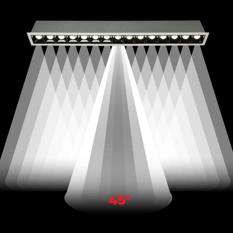 Die Leuchte hat einen niedrigen Blendungsindex (UGR<18), wodurch sie den Benutzern einen hohen Beleuchtungskomfort bietet. Ihr CRI>90 macht sie außerdem zu einer idealen Option für Projekte, die einen hohen chromatischen Index erfordern.