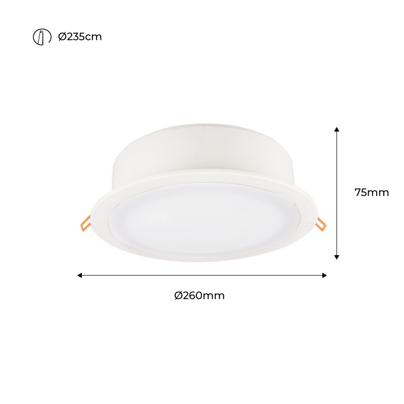 Für den Einbau des Produkts muss ein Ausschnitt mit einem Durchmesser von Ø235 hergestellt werden. Das Downlight hat eine Leistungsaufnahme von 18W und einen direkten Anschluss an 100-240V/AC. Sie können zwischen warmweiß 2700K, neutralweiß 4000K und kaltweiß 6500K wählen. So können Sie mit einem einzigen LED-Strahlermodell Küchen, Bäder, Wohn- und Schlafräume sowie Flure ausstatten und für jeden Raum die passende Farbtemperatur wählen. Der Anschluss an das Stromnetz ist einfach: Phase und Nullleiter werden auf der Rückseite angeschraubt und die Anschlüsse mit der mitgelieferten Abdeckung abgedeckt. Sie hat eine Frequenz von 50-60 Hz. Die hochwertigen Federklemmen sorgen dafür, dass das LED-Downlight komplett bündig mit der Decke abschließt. Es verfügt über die hohe Schutzart IP55 und ist damit perfekt für nasse und wassergefährdete Bereiche geeignet.