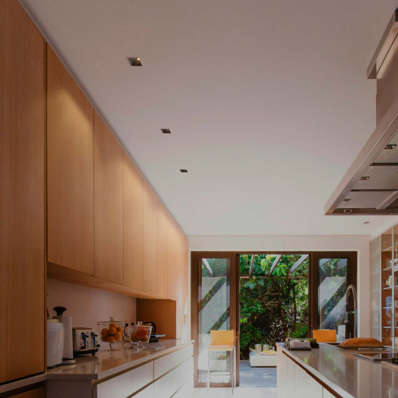 Quadratische Einbaurahmen mit asymmetrischer Ausleuchtung.