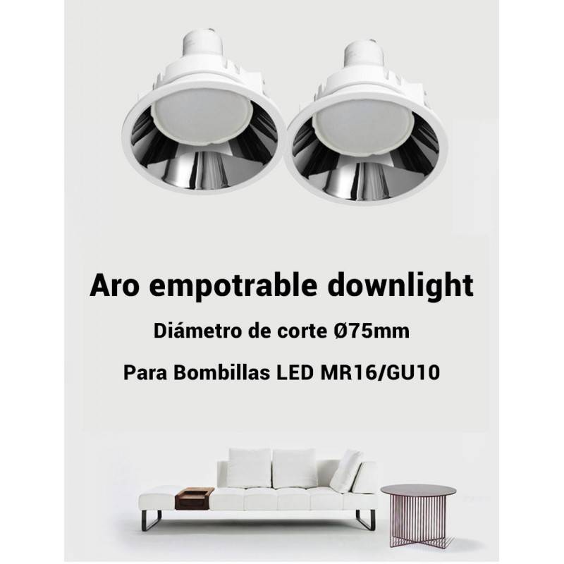Kompatibilität und einfache Installation mit dichroitischen Glühlampen oder Modulen mit externem Treiber. Er besteht aus Kunststoff, hat die Maße Ø82x35,5mm und einen Schnittdurchmesser von Ø75mm. Hergestellt aus Kunststoff und von hoher Qualität in den Ausführungen weiß, weiß und chrom sowie schwarz und weiß. Fügen Sie eine MR16/GU10 LED-Lampe in diese Einbauringe ein und beleuchten Sie jeden Innenraum mit unglaublichen Ergebnissen.