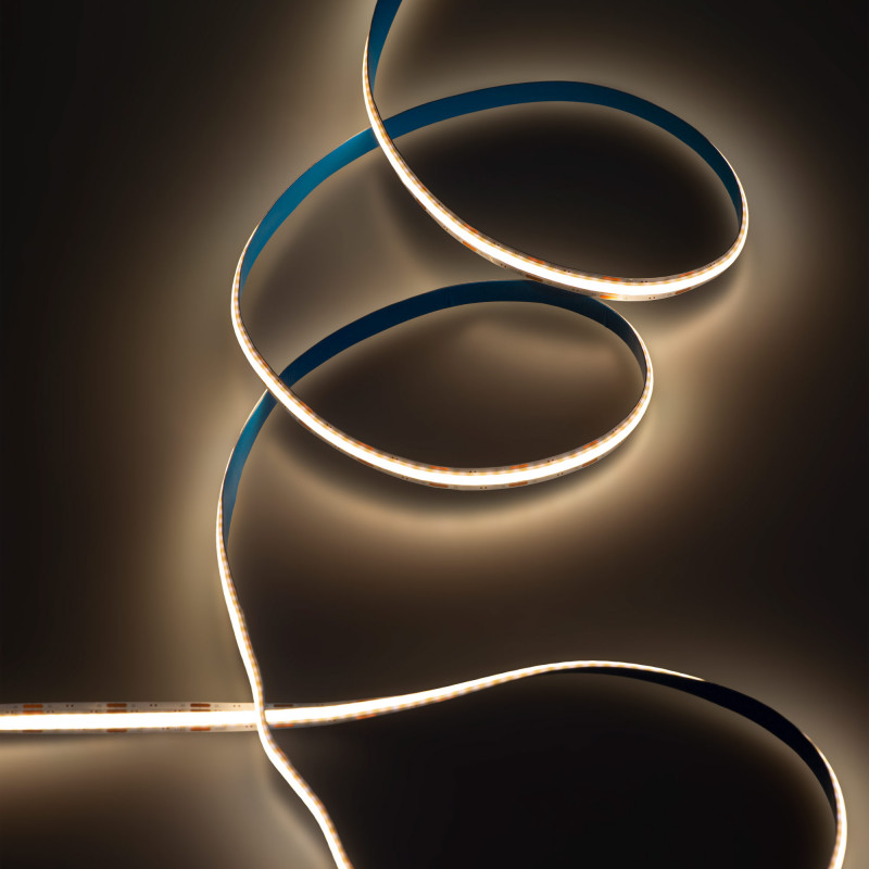 Dieser LED-Streifen verfügt über die COB-Technologie, die es ihm ermöglicht, ein kontinuierliches Licht ohne sichtbare Punkte auszustrahlen, was besonders empfehlenswert ist, wenn eine homogene Beleuchtung gewünscht wird, um mit reflektierenden Oberflächen zu arbeiten oder um transparente Diffusoren zu verwenden.