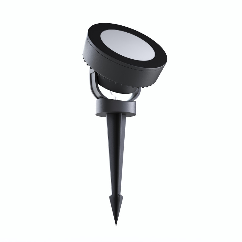 LED-Pfahl mit Spitze und rundem Design, hergestellt aus stoßfestem, korrosions- und UV-beständigem Harz. Die Installation erfolgt durch Einschlagen in den Boden, Gras oder Sand.