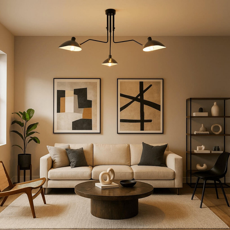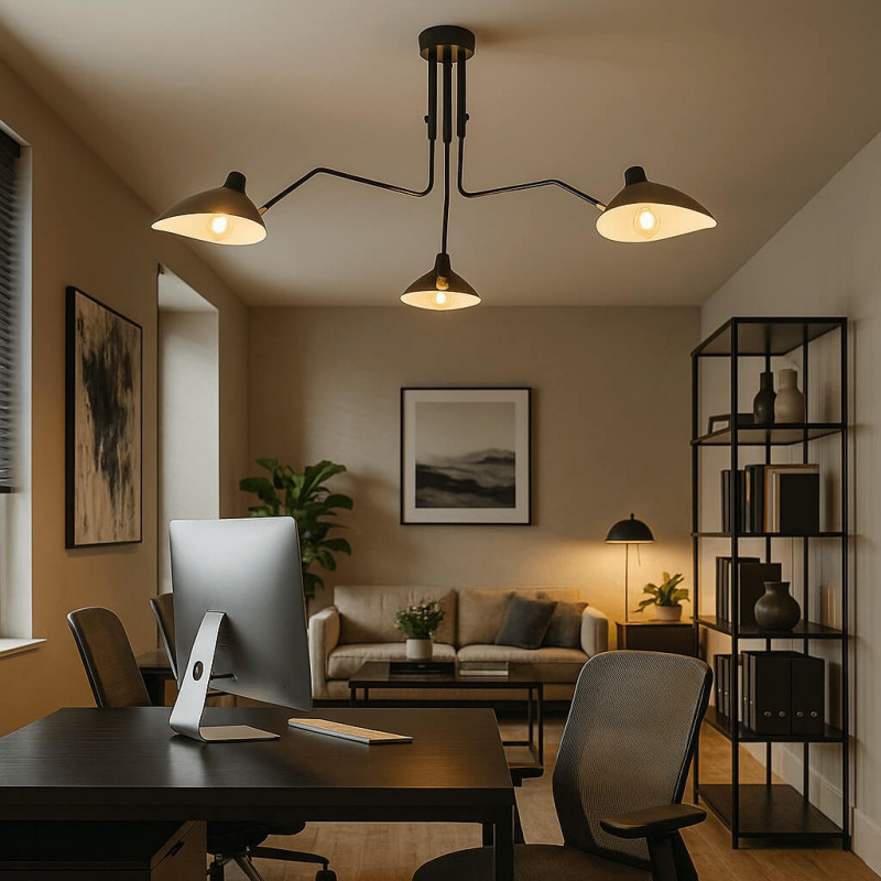 Die Arme gehen von einem gemeinsamen Baldachin aus, an dem sich der Aufhängungsmechanismus befindet, und verzweigen sich in verschiedene Richtungen, um eine ausgewogene und umhüllende Lichtverteilung zu gewährleisten.