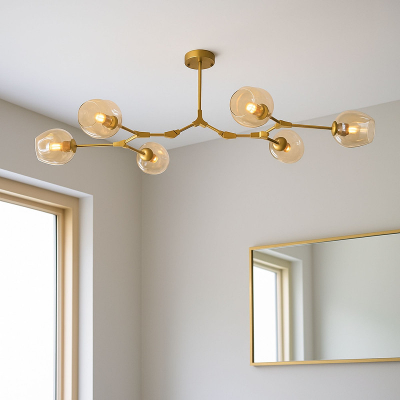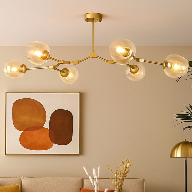Diese Hängeleuchte zeichnet sich durch ihr modernes und geometrisches Design aus und ist ideal für alle, die eine dekorative Beleuchtung mit Charakter suchen. Die gegliederte Metallstruktur und die sechs Glasschirme bringen Raffinesse in jeden Raum, von Wohn- und Esszimmern bis hin zu Arbeitsbereichen oder Geschäftsräumen.