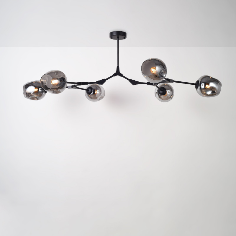 Diese Hängeleuchte zeichnet sich durch ihr modernes und geometrisches Design aus und ist ideal für alle, die eine dekorative Beleuchtung mit Charakter suchen. Die gegliederte Metallstruktur und die sechs Glasschirme bringen Raffinesse in jeden Raum, von Wohn- und Esszimmern bis hin zu Arbeitsbereichen oder Geschäftsräumen.