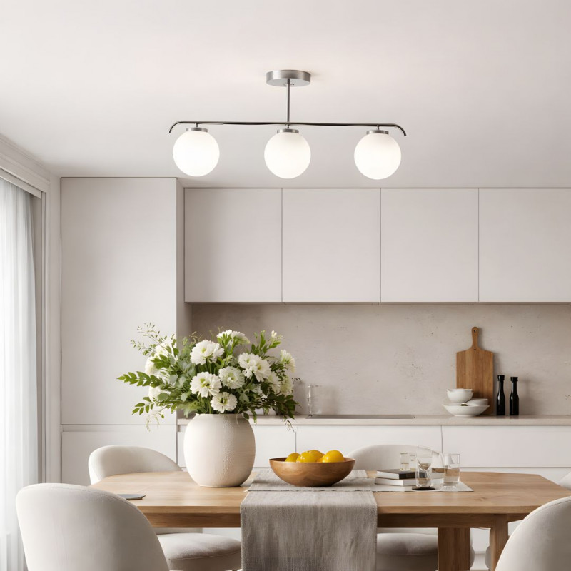 Die Deckenleuchte "Talí" besteht aus einer Metallstruktur, die mit einer zentralen Rosette und drei kugelförmigen Opalglasschirmen mit hoher Lichtdurchlässigkeit verbunden ist, die eine helle und gleichmäßige Beleuchtung gewährleisten.