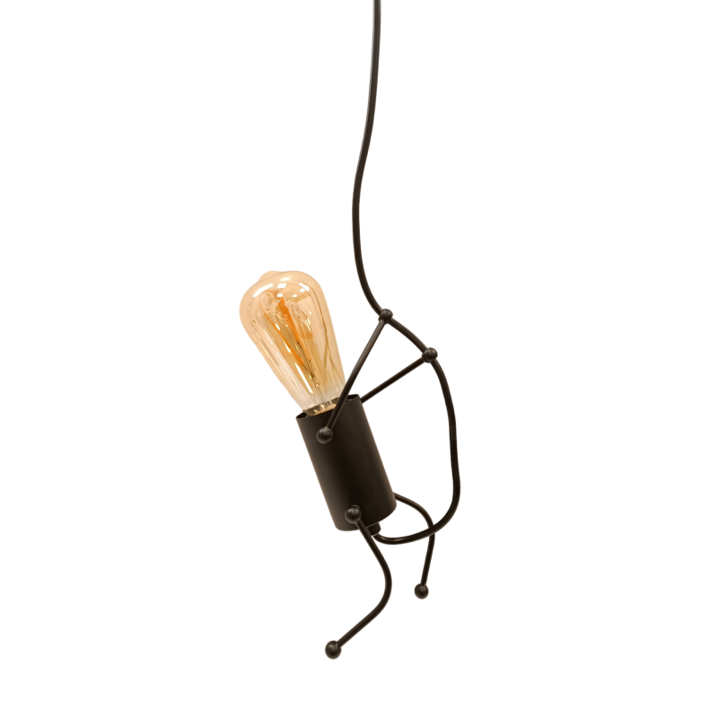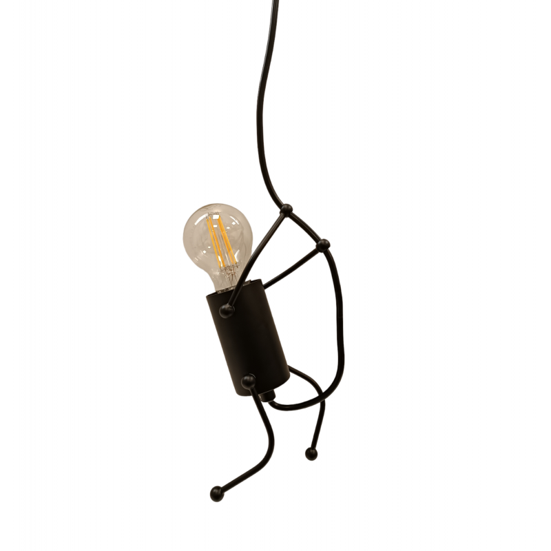 Moderne und witzige Hängeleuchte für E27 Glühbirne in Form einer Gliederpuppe. Das Design kann nach Belieben in Form einer Puppe gestaltet werden, die am Seil hochklettert.