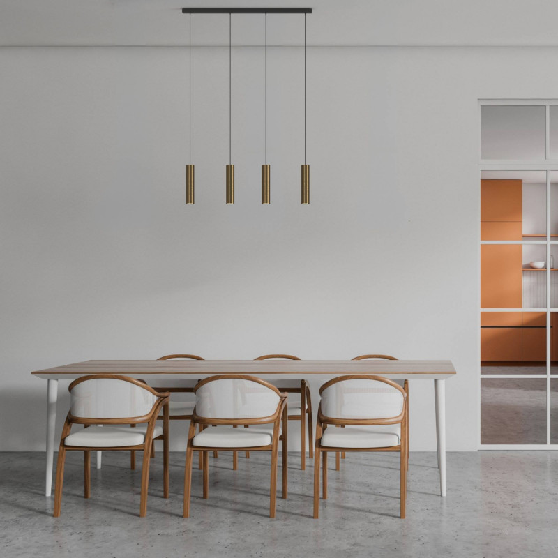 Diese Hängeleuchte besteht aus vier zylinderförmigen Strahlern und bietet ein modernes, minimalistisches Design. Sie sorgt für eine perfekte Beleuchtung mit gerichtetem Licht für den Esstisch, eine Theke oder die Kücheninsel.
