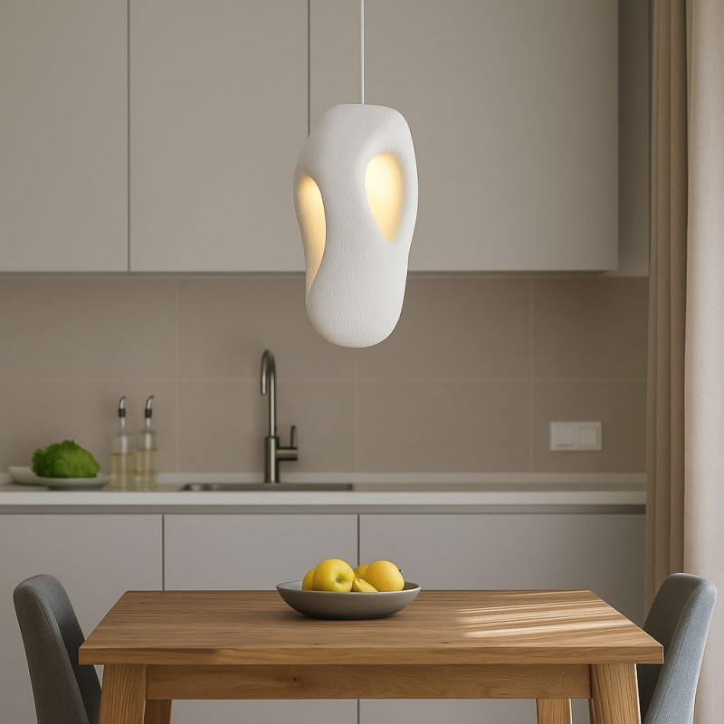 Hängelampe aus Harz mit weißer Oberfläche. Ihre unregelmäßige Struktur mit Öffnungen erzeugt eine weiche und umhüllende Beleuchtung.