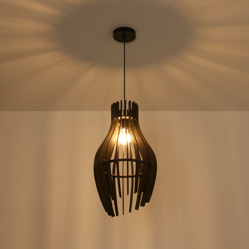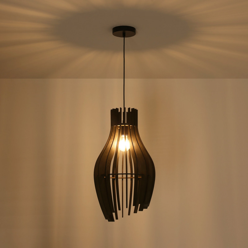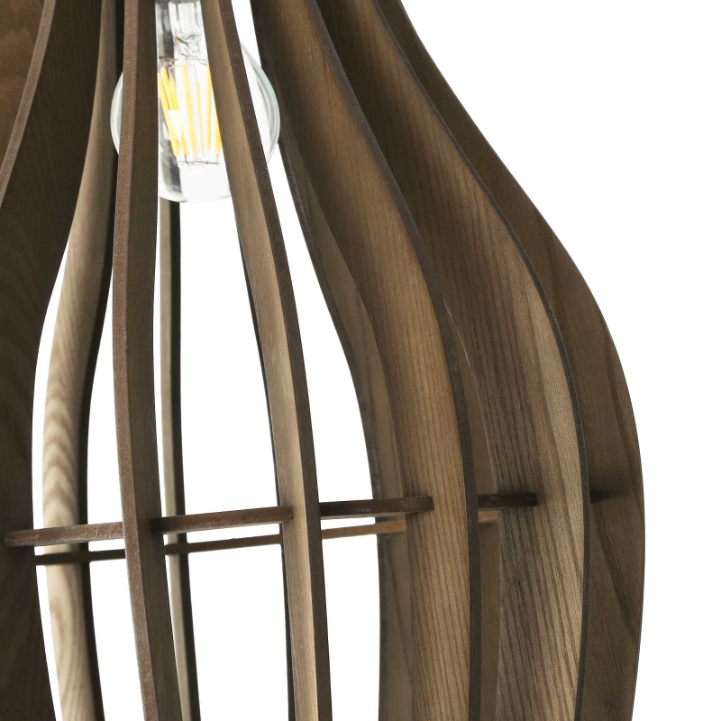 Die Hängelampe Huntel zeichnet sich durch ihren originellen Lampenschirm aus MDF-Holz aus, der ein längliches und unregelmäßiges Design aufweist.