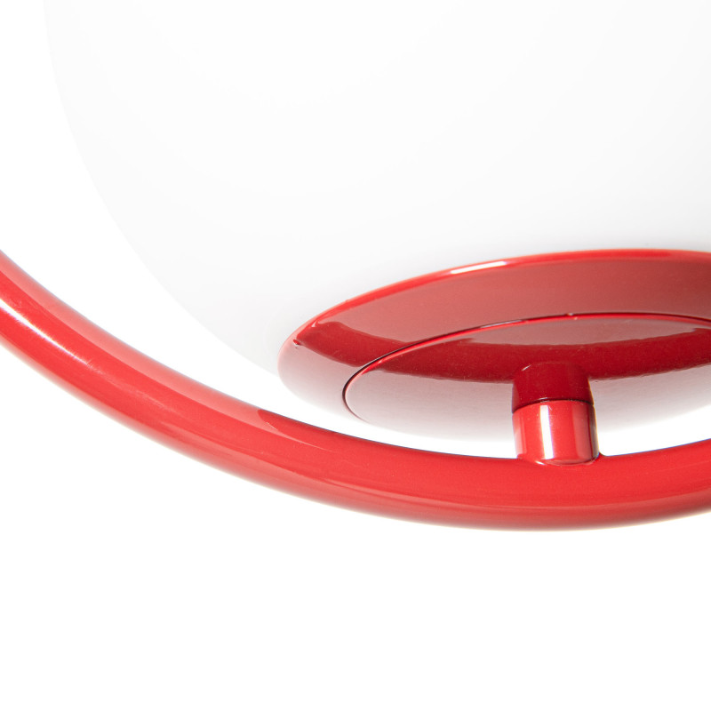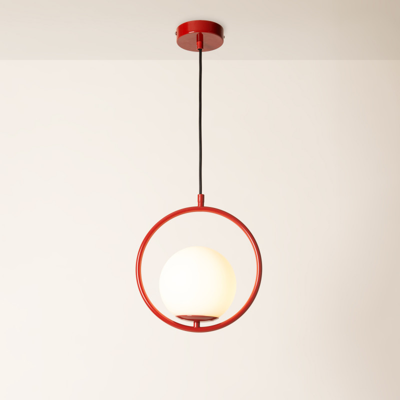 Die Hängeleuchte "Kate" besteht aus einer Opalglaskugel und einer Aluminiumstruktur, die in Gold, Schwarz, Chrom oder Rot erhältlich ist.