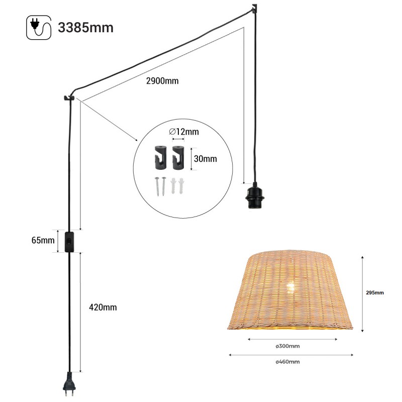 Die Fassung eignet sich für eine E27-Lampe mit einer Leistung von bis zu 60W (nicht im Lieferumfang enthalten). Das Kabel ist in drei Farben erhältlich (weiß, schwarz und Naturseil).