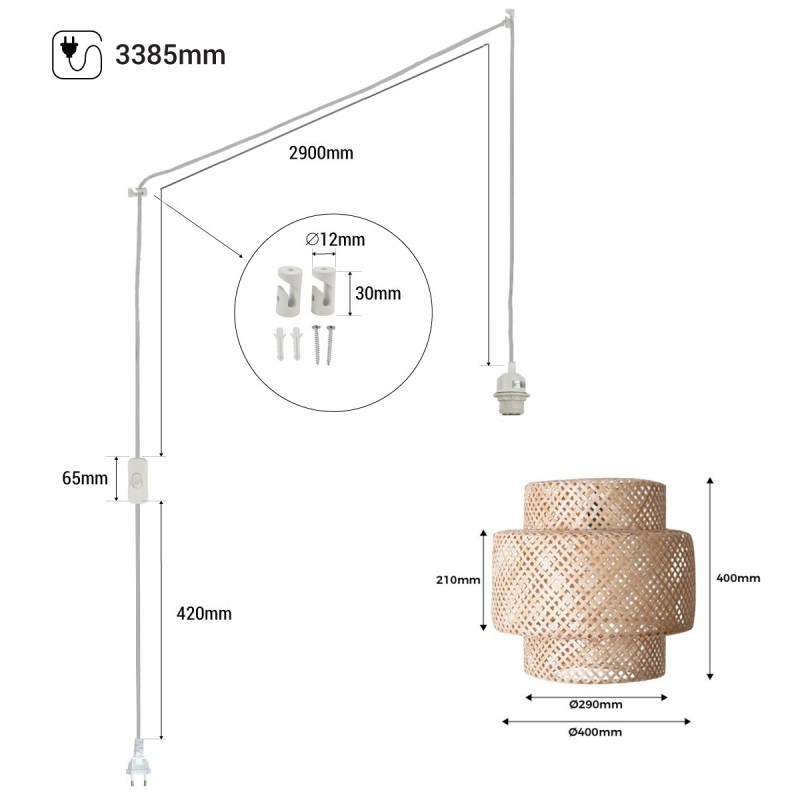 Die Fassung eignet sich für eine E27-Lampe mit einer Leistung von bis zu 60W (nicht im Lieferumfang enthalten). Das Kabel ist in drei Farben erhältlich (weiß, schwarz und Naturseil).