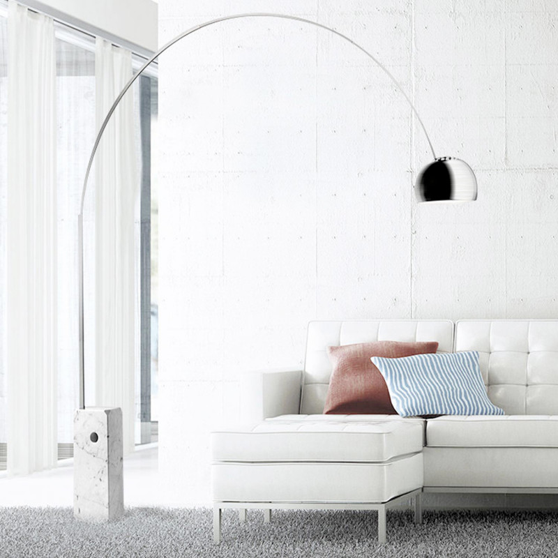 Die Stehleuchte "Bend" verfügt über einen großen Bogen, der es ermöglicht, Tische und bestimmte Bereiche zu beleuchten, ohne dass feste Lichtpunkte erforderlich sind, und verleiht dem Raum einen modernen und raffinierten Touch.