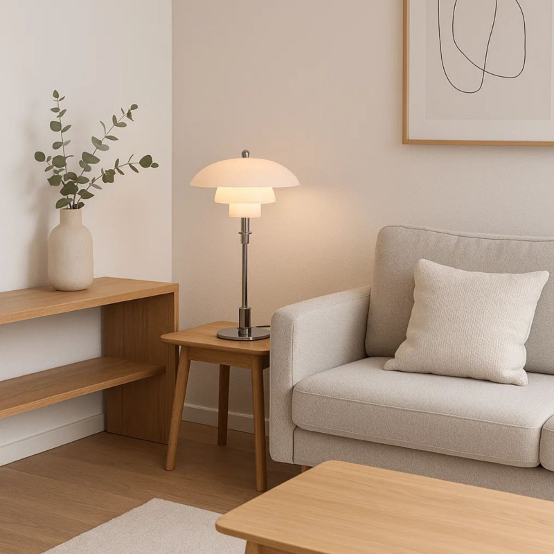Ihr Design basiert auf einem System aus drei reflektierenden Schirmen, die das Licht nach unten leiten. Die Schirme bestehen aus Opalglas und sind in einem bestimmten Abstand zueinander angeordnet, um eine weiche, diffuse und blendfreie Beleuchtung zu gewährleisten.