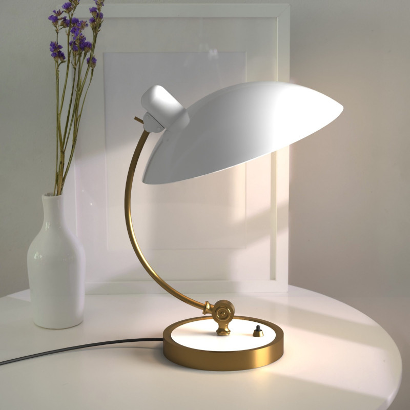 Sie ist aus hochwertigem Aluminium gefertigt, hat eine elegante goldene Struktur und einen Schirm in schwarzer oder weißer Ausführung.