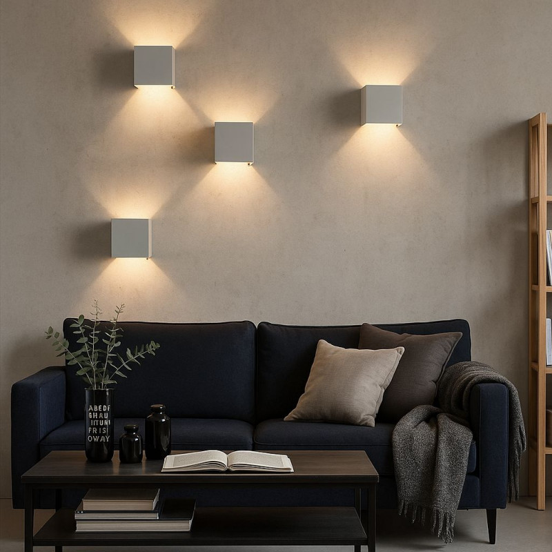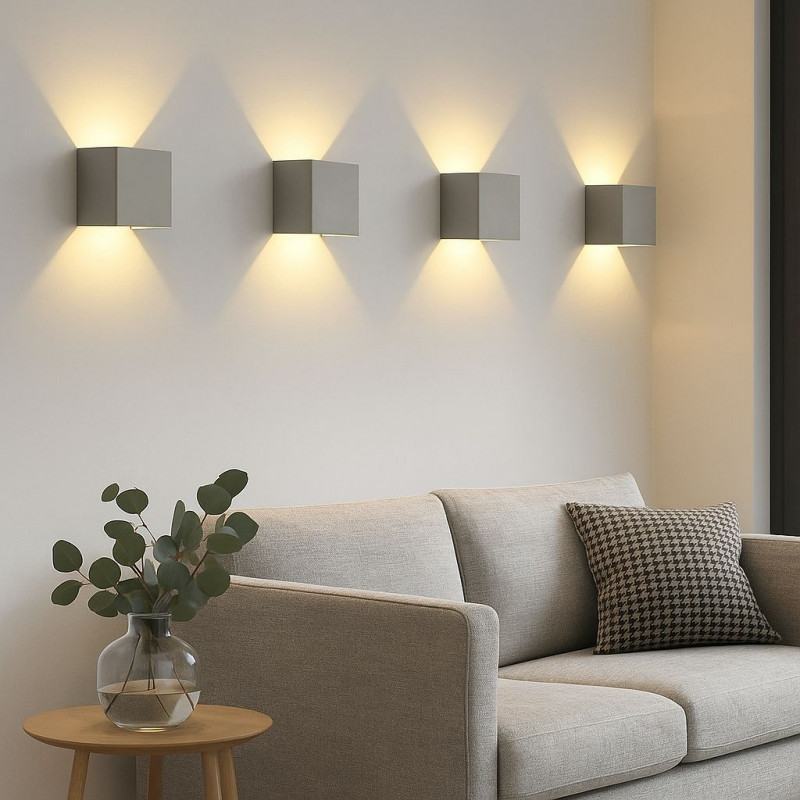 Packung mit 4 Wandleuchten von 6W mit einstellbarer Lichtöffnung sowohl für das oben als auch für das unten abgestrahlte Licht. Er ist aus Aluminium gefertigt und kann dank der Schutzart IP44 sowohl im Innen- als auch im Außenbereich eingesetzt werden. Elegantes und minimalistisches Würfeldesign. Wandleuchte mit COB-Chip. Erhältlich in drei Farben: weiß, schwarz und grau.