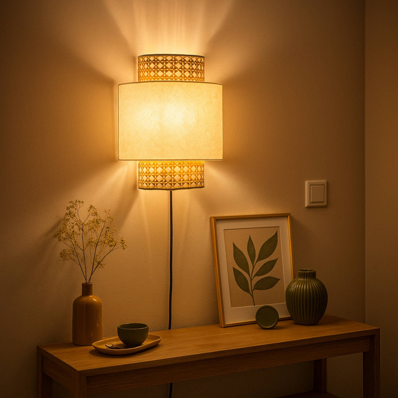 - Dekorative Beleuchtung: Der Schirm aus Weidengeflecht und Stoff lässt das Licht warm und gleichmäßig durch und schafft eine gemütliche Atmosphäre.