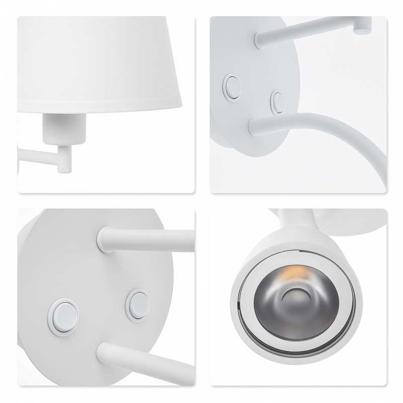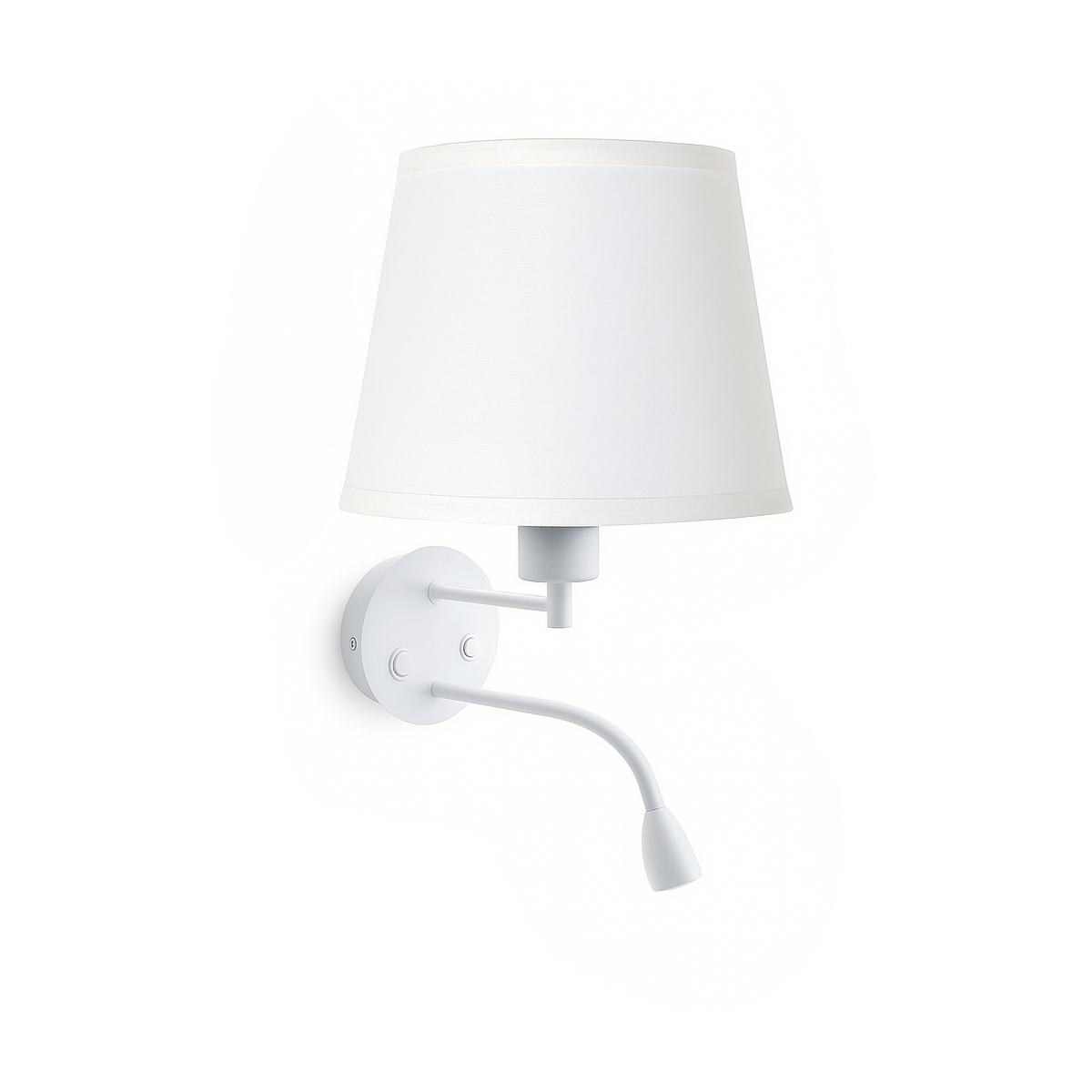 Diese Wandleuchte zeichnet sich durch ihre Doppelfunktionalität aus, denn sie verfügt über einen Stoffschirm mit einer E27-Fassung, die eine allgemeine Beleuchtung ermöglicht, und gleichzeitig über eine verstellbare LED-Leuchte, die speziell als Leselampe konzipiert wurde. Beide Leuchten werden mit unabhängigen Schaltern ein- und ausgeschaltet.