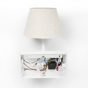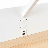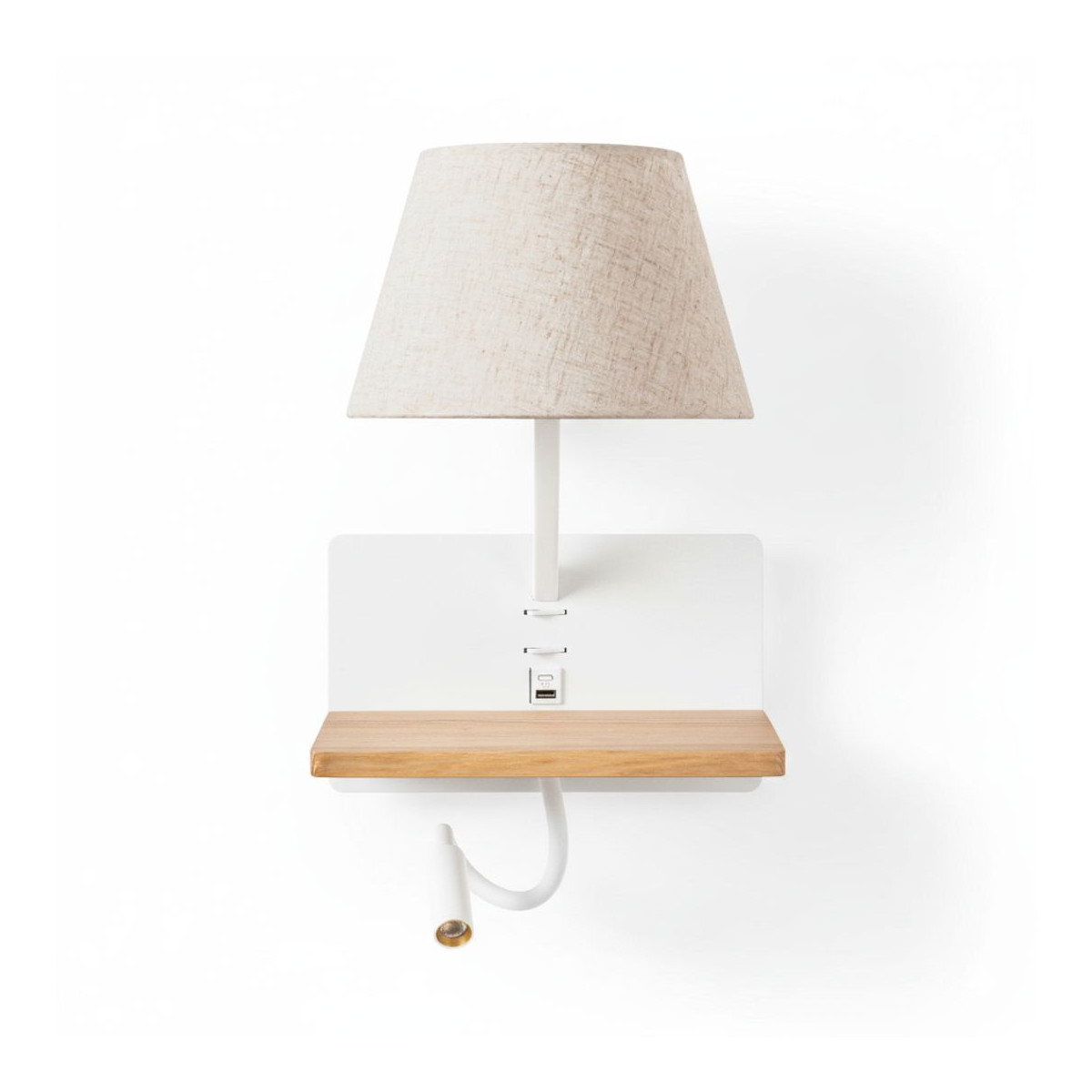 Die Wandleuchte verfügt über einen USB- und einen USB-C-Anschluss sowie einen Holzsockel zur Aufnahme des Mobiltelefons, was ein praktisches Aufladen während der Nacht ermöglicht.