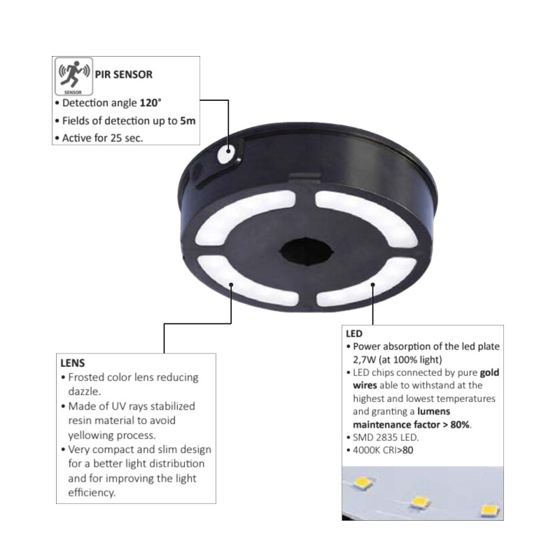 - PIR-Sensor: verfügt über einen PIR-Bewegungssensor, der die Leuchte automatisch aktiviert. Erfassungswinkel des Sensors: 120° (bis zu 5 m).
