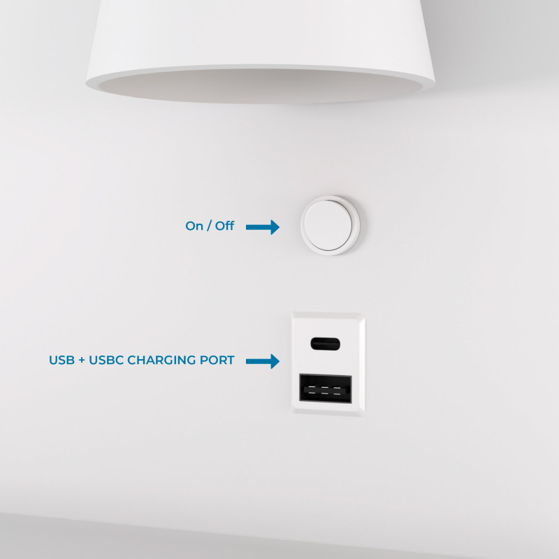 Darüber hinaus verfügt sie über einen USB-Anschluss und einen Metallsockel, der das Aufladen des Mobiltelefons während der Nacht ermöglicht.