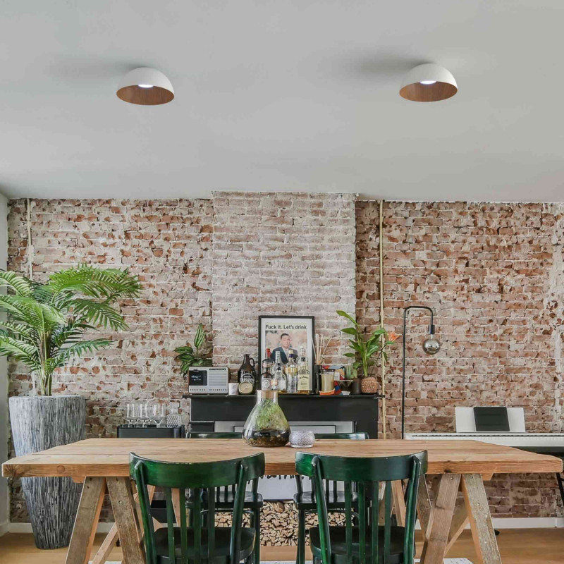 LED-Deckenleuchte aus Metall in weißer oder schwarzer Ausführung mit Holzoptik im Innenteil und Polycarbonat-Diffusor.