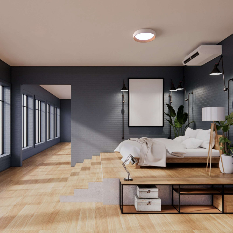 Unsere LED-Deckenleuchte kombiniert ein weißes Gehäuse aus Polycarbonat mit einem Holz-Look auf der Innenseite und verleiht dem Raum einen Hauch von Wärme und Zeitgeschmack.