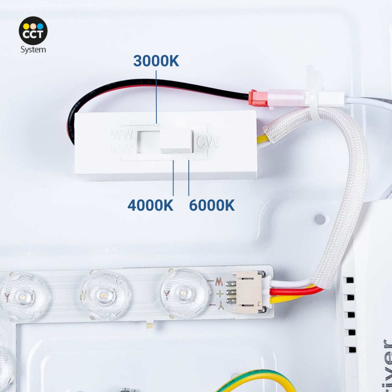 Darüber hinaus kann über das CCT-System die Lichtfarbe in drei Varianten eingestellt werden: Warmweiß (3000K), Neutralweiß (4000K) und Kaltweiß (6000K). Dies bietet eine große Vielseitigkeit, um das gewünschte Beleuchtungsprojekt zu erzielen.