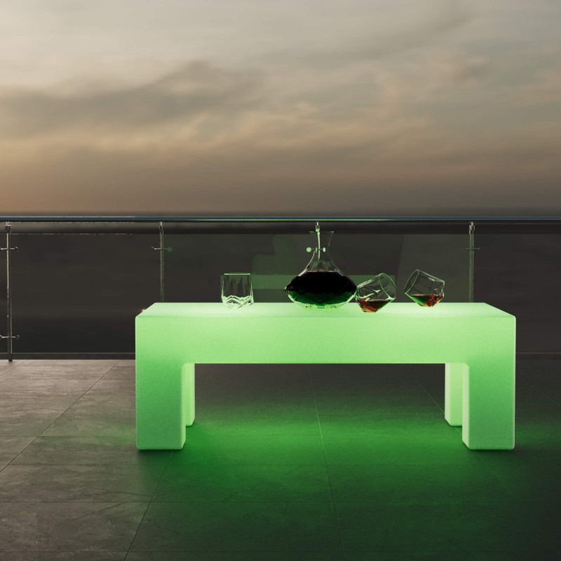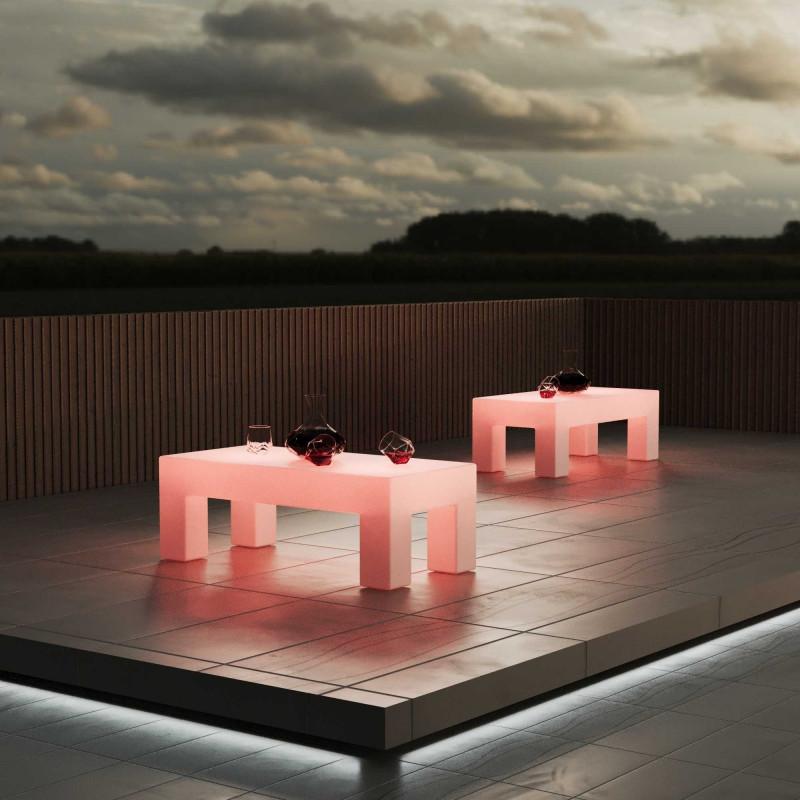 Ein LED-Tisch für den Außenbereich, der jeder Umgebung einen modernen und stilvollen Touch verleiht. Passen Sie die Atmosphäre an Ihre Vorlieben an und wählen Sie zwischen sanften Tönen und leuchtenden Farben.