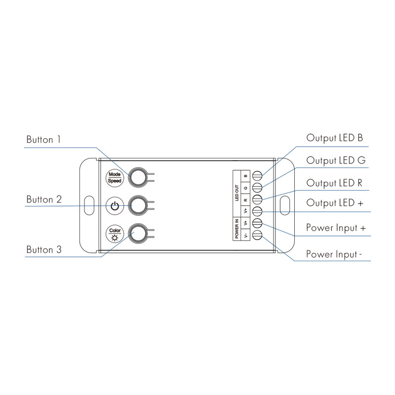 Der 3-Kanal-RGB-Controller ermöglicht eine vielseitige Beleuchtungssteuerung über eingebaute Tasten. Dieses Gerät verfügt über drei Funktionstasten: