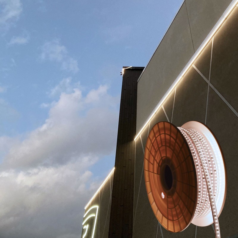 Der LED-Streifen wird in einer 50-Meter-Rolle geliefert, mit einem Anfangsanschluss an das Stromnetz und einem Endanschluss mit Stecker. Er kann alle 100 mm den Markierungen entsprechend gekürzt und an jedes Ende kann ein Siliakonstopfen angebracht werden. Der Streifen ist 12 mm breit und hat eine selbstklebende Rückseite von 3M, um auf der gewünschten Oberfläche zu haften.