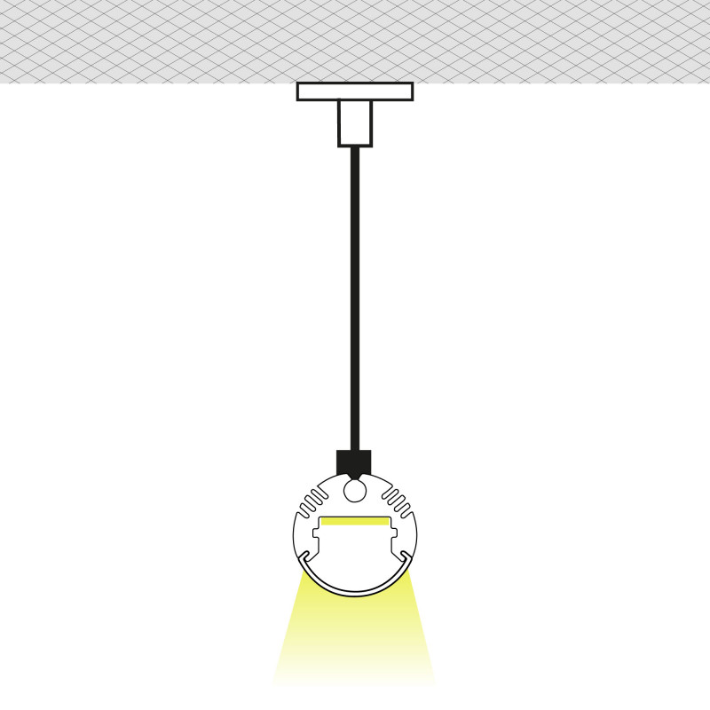 - Vielseitige Installation: Aufgrund seiner zylindrischen Form ist dieses Profil speziell für eine hängende Installation konzipiert (Installationskit im Lieferumfang enthalten - 1 m lange Stahlseile). Es kann auch mit einem Zubehörteil (nicht im Lieferumfang enthalten) an der Oberfläche montiert werden.