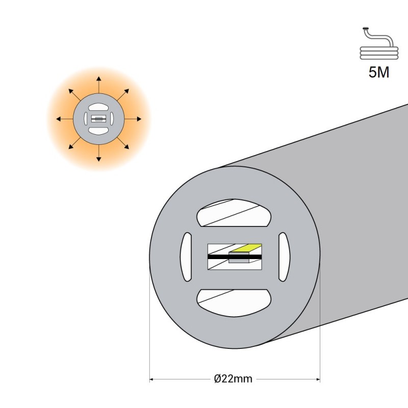 LED Neon-Schlauch 360° rund - Ø 22 mm - 5 Meter - 24V DC - 240 LEDs/m - 19,2 W/m - IP65