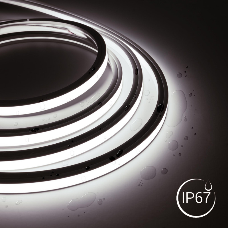 Das LED-Neon aus Neutralsilikon mit UV-Schutz und der hohen Schutzklasse IP67 ist selbst unter rauen Umgebungsbedingungen widerstandsfähig und langlebig, sodass es auch im Außenbereich zum Einsatz kommen kann.