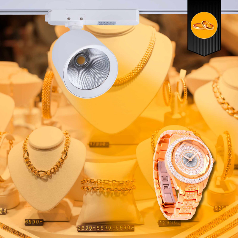 Dieser einphasige LED-Stromschienenstrahler kombiniert Effizienz und Ästhetik mit einem speziellen LED-Chip, der die Präsentation von Gold verstärkt und für ein opulentes und elegantes Aussehen sorgt.