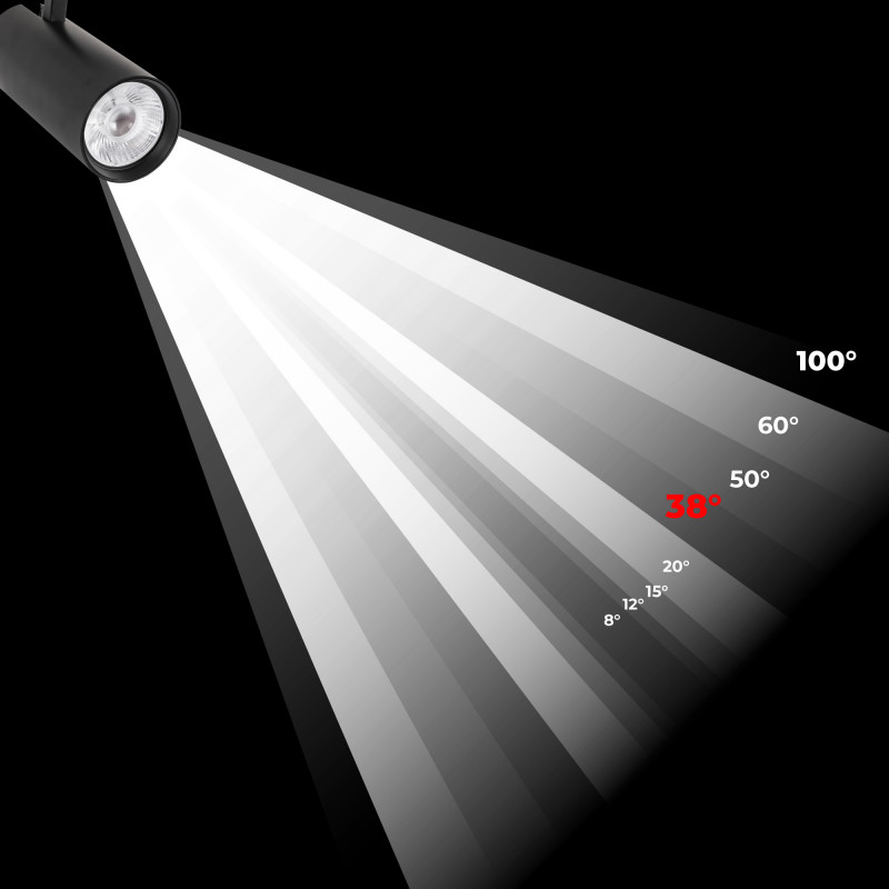 Er ist einstellbar, hat einen Abstrahlwinkel von 38° und bietet einen hohen Farbwiedergabeindex (CRI>90), perfekt für die kommerzielle Beleuchtung.