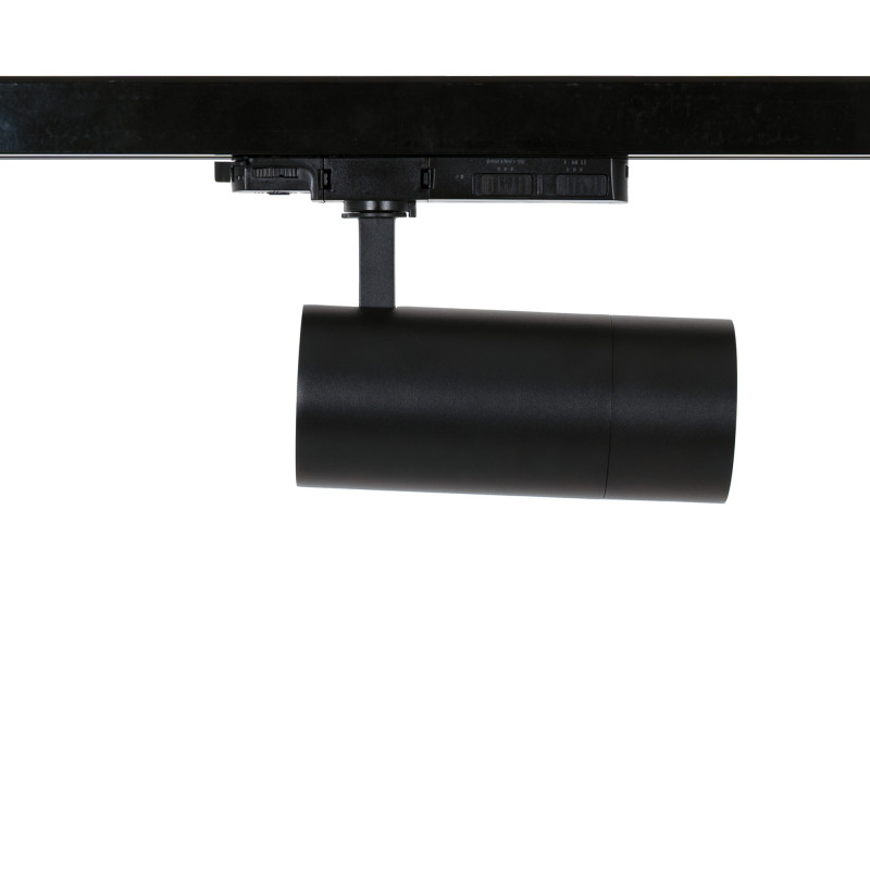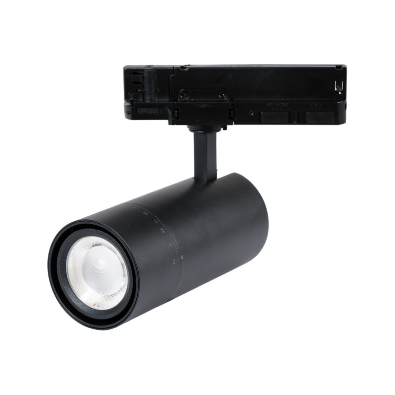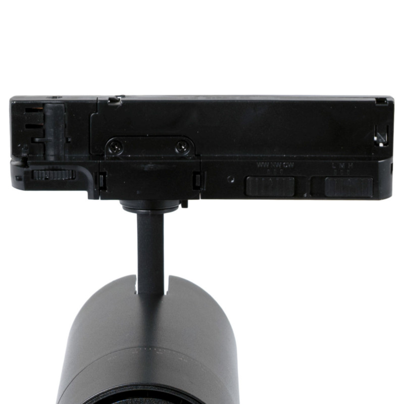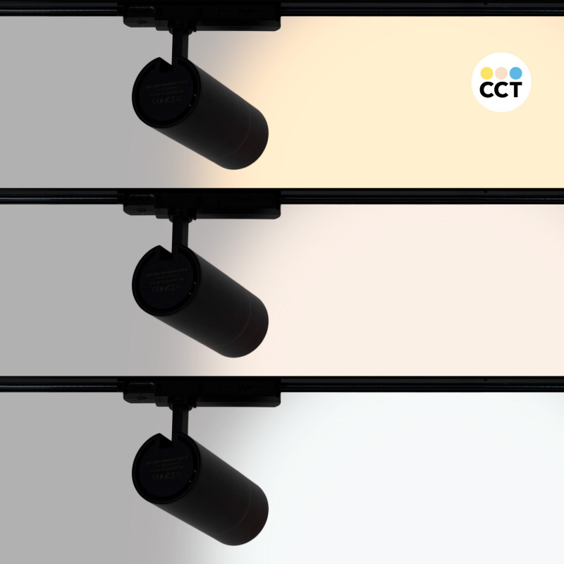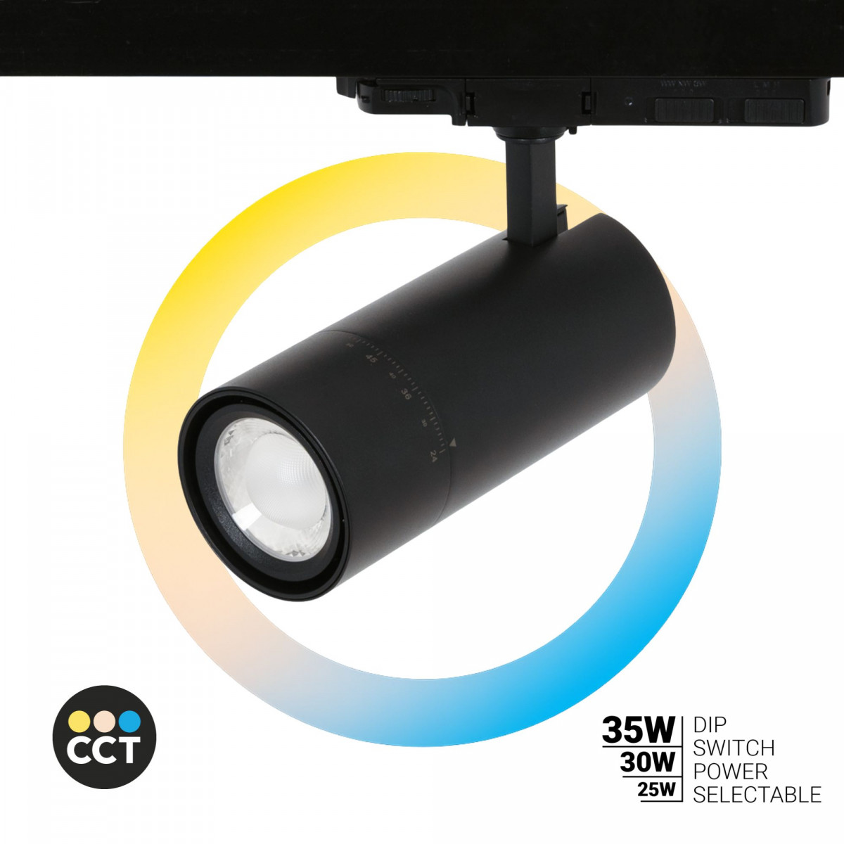 Dreiphasiger LED-Schienenstrahler mit dimmbarer Leistung (25W, 30W oder 35W) und integriertem CCT-System zur Auswahl der Farbtemperatur zwischen 2700K, 4000K und 6000K.