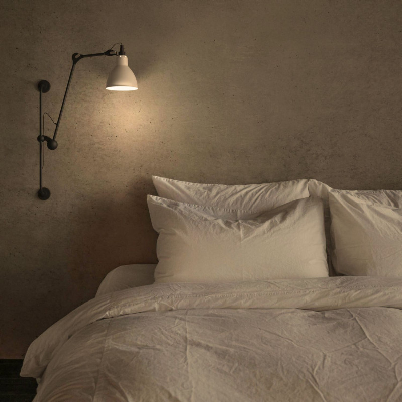 - Die Leuchte verfügt über eine feste Struktur für die Wandmontage und einen Gelenkarm mit drei Verstellpunkten, mit denen die Teile und der Lampenschirm geneigt werden können. Der längste Teil kann um 360° geschwenkt werden.