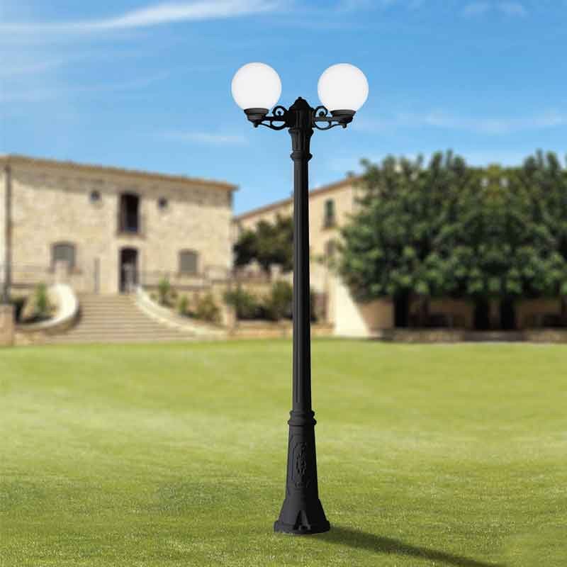 Diese Doppellaterne besteht aus zwei Diffusorkugeln aus opalem Polymethylmethacrylat (PMMA) mit einem Durchmesser von 250 mm und einem Sockel aus stoßfestem Harz, der resistent gegen Rost, Korrosion und UV-Strahlen ist.