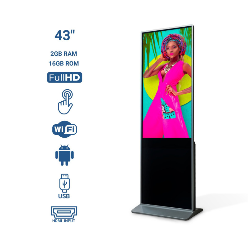 Full HD screen (1920x1080) of 43" and 16.7 million colors. Simple design, anti-shock tempered glass, simple operation, multiple and secure protection. It allows to insert mouse and keyboard in the USB port and can be used as a computer.