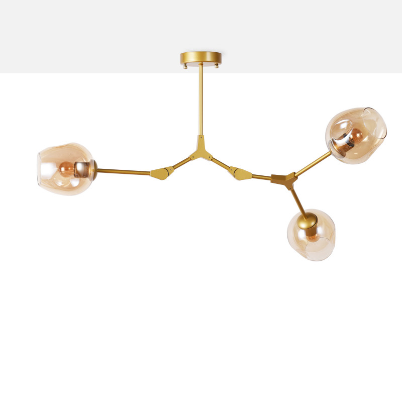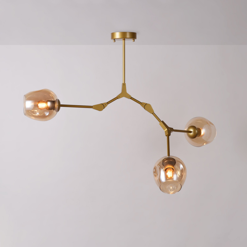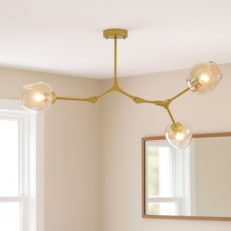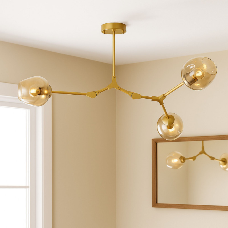 This pendant lamp stands out for its modern and geometric design, perfect for those looking for decorative lighting with character. Its articulated metal structure and three glass shades bring sophistication to any room, from living and dining rooms to work spaces or commercial premises.