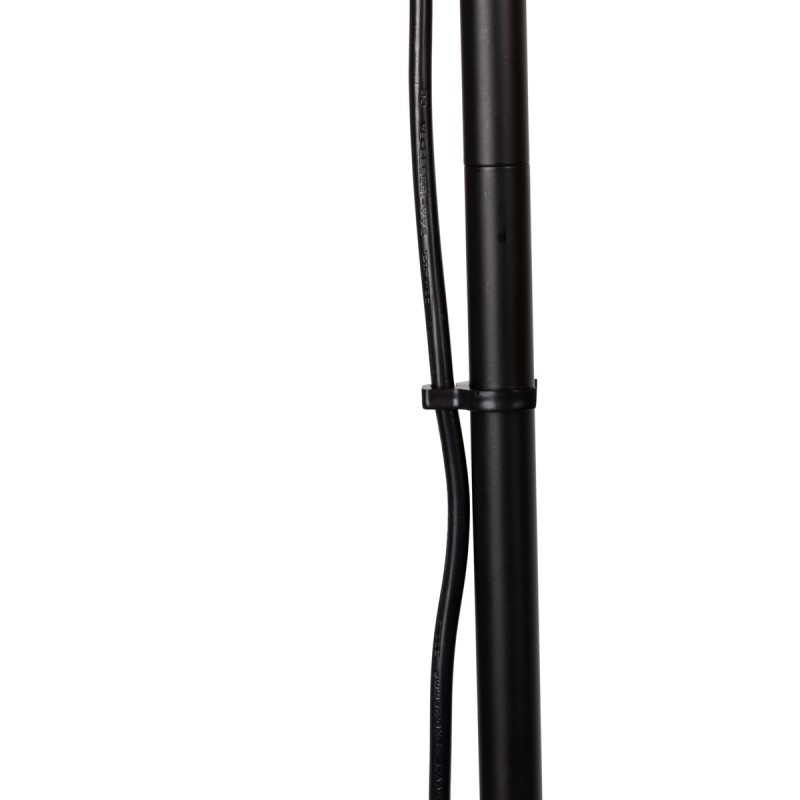 This floor lamp has a black metal structure with a firm, counterweighted base to prevent tipping and damage to surfaces.
