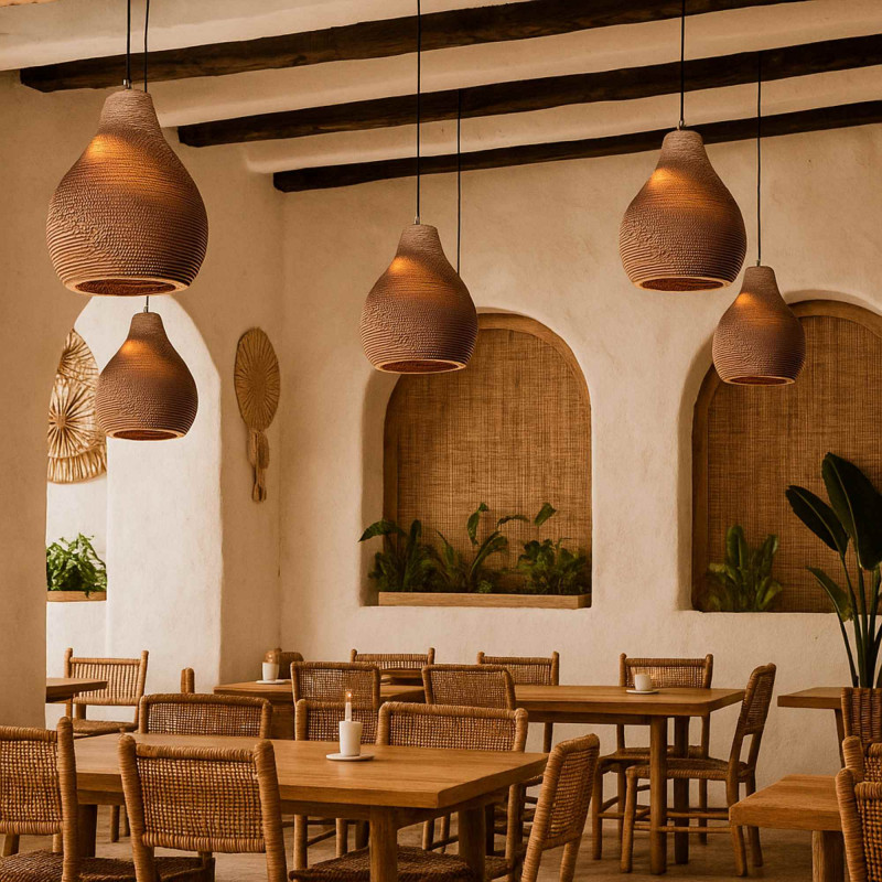 - Ecological material: Shade made of corrugated cardboard, a sustainable and recyclable material that provides lightness and durability.